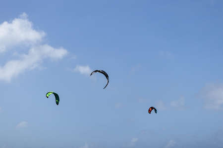 Kite-surfing against a beautiful blue sky. Many silhouettes of kites in the sky. Travel concept. Beauty world. watersports. Wind lovers. Type of kite. Kite course