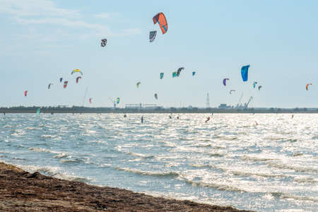 Lots of kites. Sea coast, in the coastal zone there are many extreme sports athletes