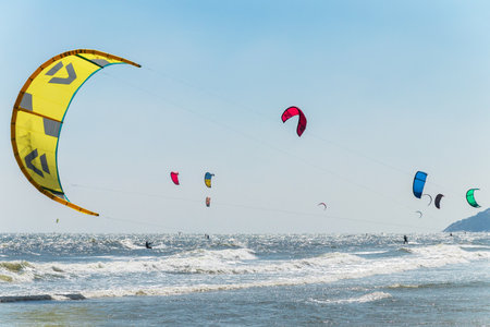 Mui Ne, Phan Thiet, Vietnam - Feb 16, 2015: Kitesurfing - water sport. Kite surf active people training Mui Ne Coco Beach, Phan Thiet Cam Ranh Bay Vietnam. Education school surf.