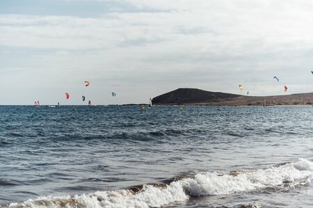 Many colorful kites on beach and kite surfers riding waves during windy day in canarian El Medano in Tenerife with Montana roja hills on horizon