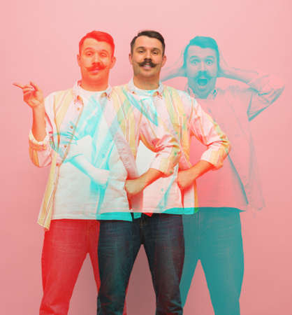 Young Caucasian man in casual clothes on pink background with glitch effect.
