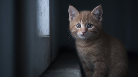 This charming image features a ginger kitten sitting by a window, illuminated by soft light. Its big eyes and playful demeanor create an adorable atmosphere perfect for cat lovers.
