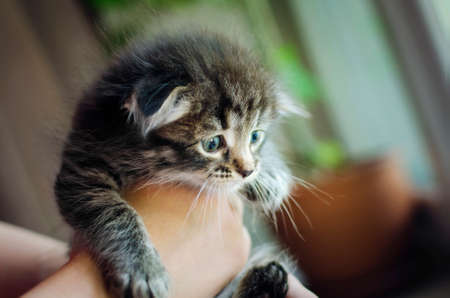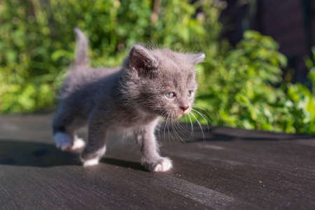 Little newborn gray kitten are waiting for the cat. Cute funny home pets. Close up domestic animals. Kitten at one month old of life on nature, outdoors