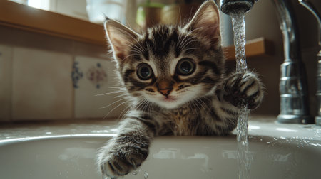 An adorable image of a cat standing in a sink, water running from the faucet while it gets a gentle bath, with its paws lifted, looking curiously at the water