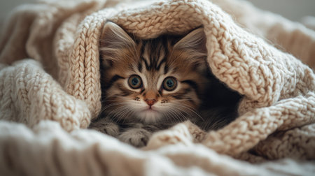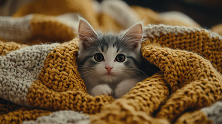 A delightful fluffy kitten nestled within a cozy knit blanket, radiating warmth and cuteness. This heartwarming scene captures pure comfort and innocence.
