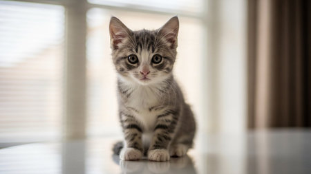 A cute grey tabby kitten sitting on a shiny surface indoors with a blurred window background
