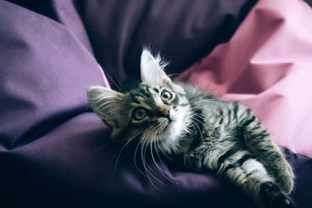 Funny gray tabby cute kitten with beautiful big eyes on bright trendy purple and pink background. Lovely fluffy cat on colored background. Fluffy pet is gazing curiously
