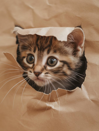 Close-up of a curious and excited kitten having fun in a cardboard box, paws in motion and playful expression.