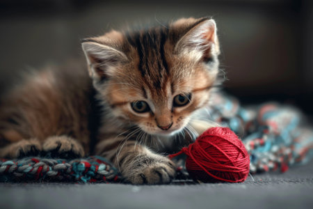 A small kitten lounges on a warm blanket, next to a bright ball of yarn, embodying innocence and curiosity, A curious kitten playing with a ball of yarn, AI generated