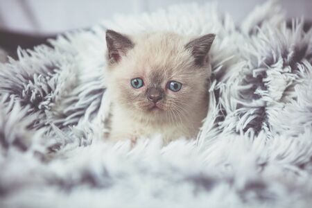 Cute little kitten with blue eyes on a gray background. Studio shot.