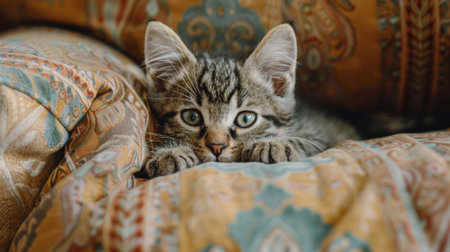 Small tabby kitten with striking eyes relaxing on a colorful patterned couch