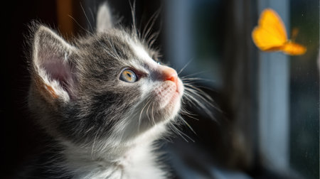 A playful kitten observes a delicate butterfly fluttering near the window, captivated by its movement in gentle sunlight.