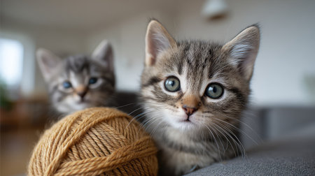 Two kittens playing with yarn beside a sofa in a minimalistic living room with white walls and open floor space