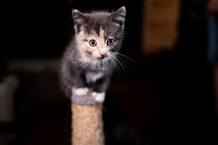 Close up of a cute kitten with captivating eyes gazing upwards, its delicate features and soft fur highlighted by warm lighting, creating a heartwarming scene of innocent curiosity
