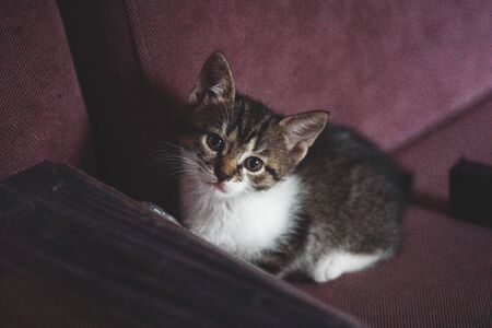 small gray striped kitten is looking into frame. kitten is 1 month old. Newborn kitten without mom.