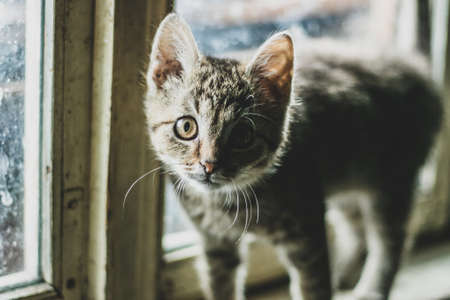 A charming tabby kitten sits near a window, showcasing its fluffy fur and bright eyes. This captivating scene captures the warmth and playful spirit of a beloved pet in a cozy indoor atmosphere.