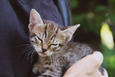 Cute one-week tabby blind kitten. Human hand holding a striped brindled kitty cat outdoors in a sunny day blurred background.
