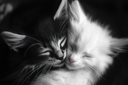 Adorable close-up of two black and white kittens snuggling, symbolizing comfort, warmth, and pet companionship.