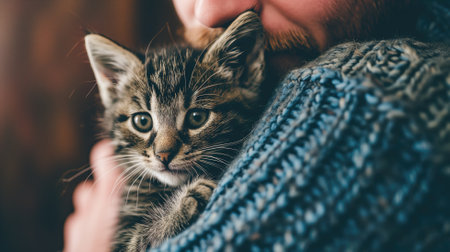 Striped kitten sitting on a woman hand, looking up with a curious and gentle expression, against a cozy indoor background.