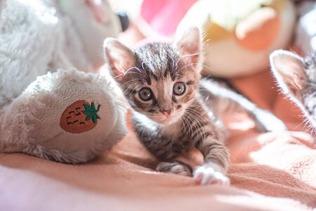 Homeless animals. abandoned kittens, cute kittens are playing, looking at the camera. Animal welfare in a homeless shelter. Low key, toned photo.