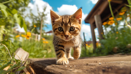 A charming young kitten gazes curiously at its surroundings in a vibrant garden setting, surrounded by flowers and greenery, evoking innocence and playfulness.