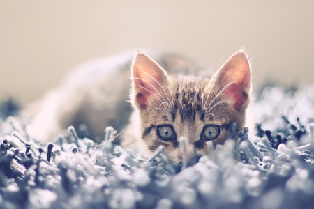 Small Kitten lies under the gray blanket. Shallow Depth of Field. SDF.