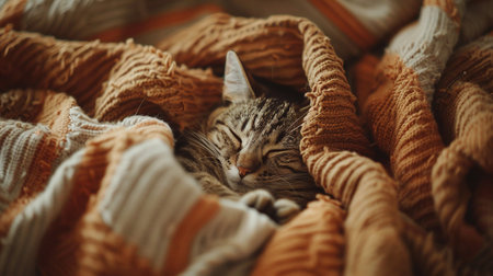 Cozy tabby cat sleeps peacefully, wrapped in warm blanket closeup image, ai generated. Sleepy kitty. Feline autumnal coziness close up photography. Comfort and relaxation concept photo realistic