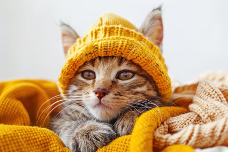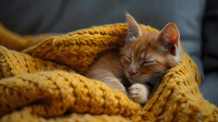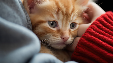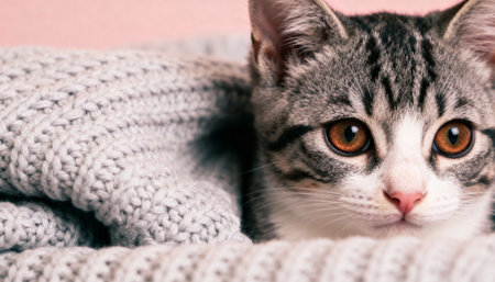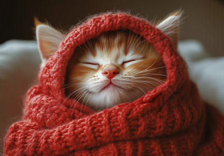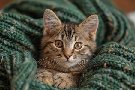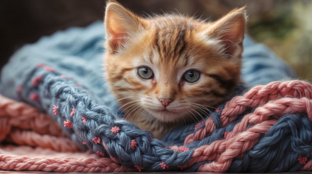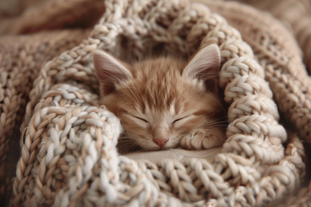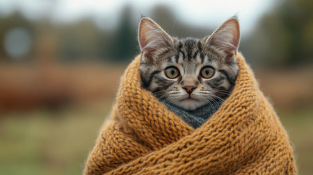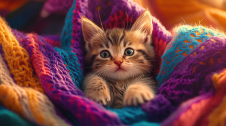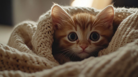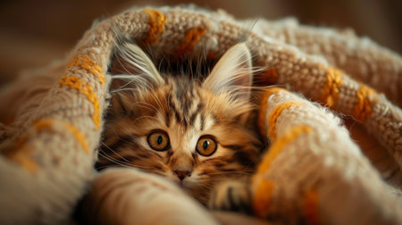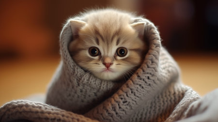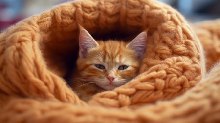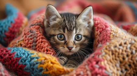 A delightful fluffy kitten nestled within a cozy knit blanket, radiating warmth and cuteness. This heartwarming scene captures pure comfort and innocence.