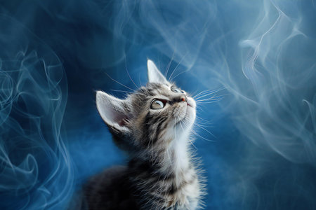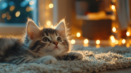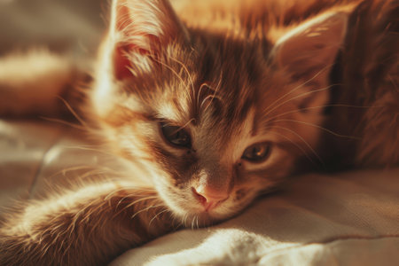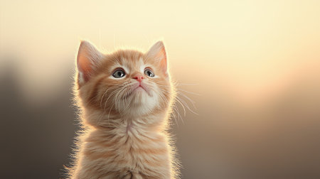 Close up of a cute kitten with captivating eyes gazing upwards, its delicate features and soft fur highlighted by warm lighting, creating a heartwarming scene of innocent curiosity