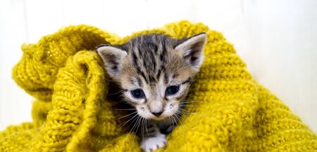 The striped kitten is wrapped in a yellow knitted scarf. The cat warms itself in the cold autumn. Pet.