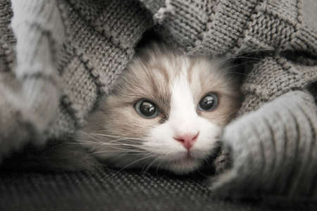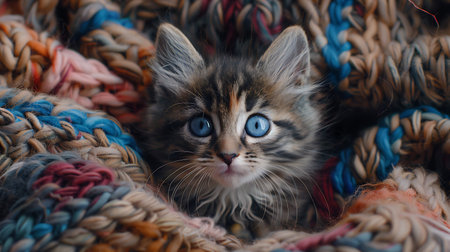 A fluffy kitten peeks out from a cozy knitted blanket, showcasing its cute expression and large eyes. This heartwarming image captures comfort and innocence.