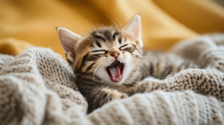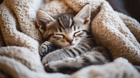 A playful tabby kitten sleeps soundly while nestled in a soft knitted blanket, enjoying a peaceful afternoon nap in a warm, inviting space.