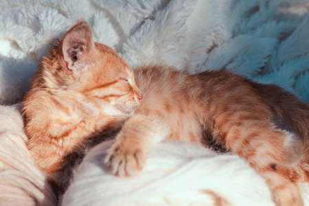 Small white red kitten sleeps with a ball of white thread on a soft blanket in the sunlight. The kitten played and fell asleep