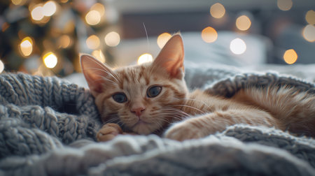 Peaceful kitten snuggled in a soft blanket inside a basket, surrounded by a glowing holiday background of festive lights.