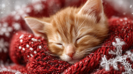 This charming image captures a sleeping orange tabby kitten nestled in a cozy red knit blanket, surrounded by soft snowflakes. Ideal for evoking warmth and tranquility during winter.