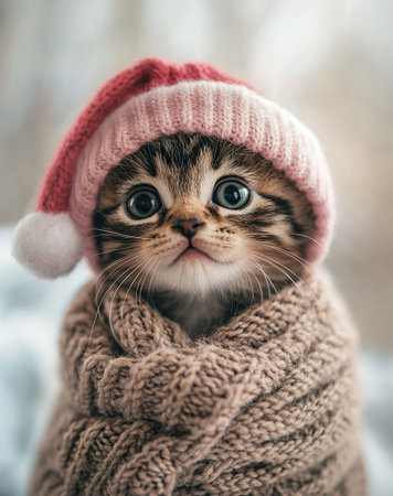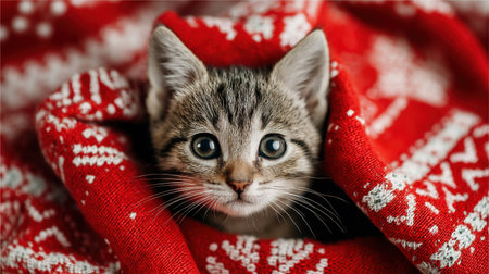 This heartwarming image features a cute tabby kitten snuggled in a cozy red sweater with white snowflakes, symbolizing warmth and cuteness for winter.