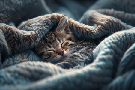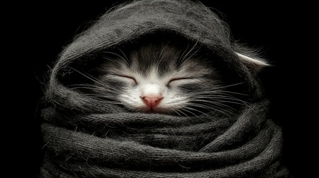 A cute kitten sleeps peacefully, wrapped in a dark blanket. The image conveys warmth and tranquility, showcasing the beauty of a cozy moment in nature.