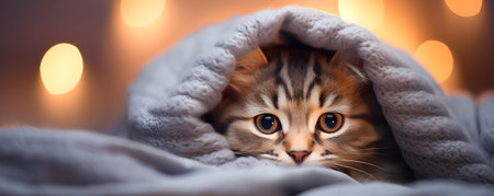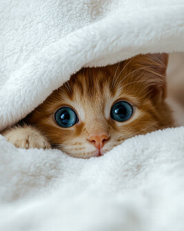A close-up shot of an adorable kitten peeking out of a cozy blanket, its big eyes full of curiosity and wonder, evoking warmth and cuteness in a soft, homey setting.