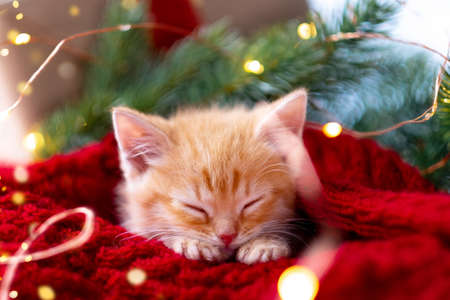 Ginger kitten sleeping with Christmas lights on red. Orange red Cat happy dreams. Holidays and relax.