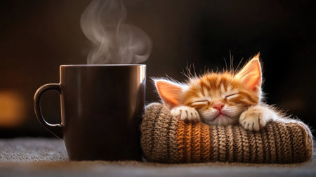 A sweet and cozy scene featuring a sleeping kitten next to a steaming coffee mug on a soft blanket, radiating warmth and tranquility in a serene setting.