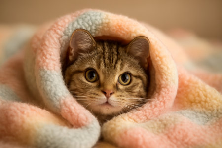 AI generated image of a cute American Wirehair cat peeking out from a soft pastel blanket. Its large, expressive eyes and cozy setting evoke warmth, playfulness, and comfort