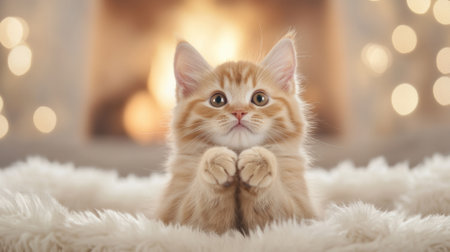 A kitten sitting on a fluffy blanket with its paws up, AI