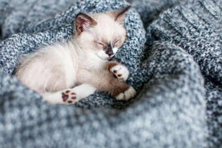 Kitten sleeping on gray blanket. Cat sleep in clothes