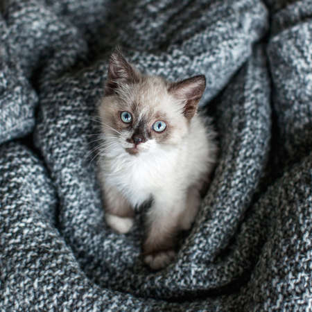 Kitten on gray knitted blanket. Small cat with blue eyes at home