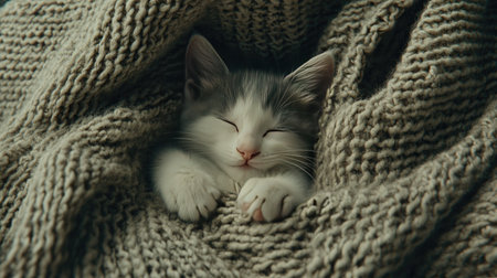 A charming gray and white kitten peacefully sleeps, cradled in a soft knitted blanket, radiating warmth, comfort, and serenity in a cozy indoor setting.