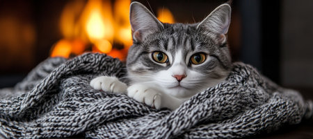 Cozy Indoor Scene Featuring a Grey Tabby Cat Relaxing by a Warm Fireplace on a Soft Fabric Blanket
