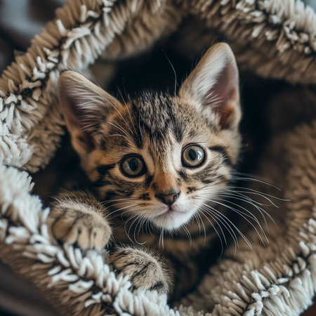 A charming striped kitten gazes curiously from its cozy basket, surrounded by soft blankets, embodying the innocence and playfulness of youth.