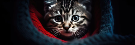This delightful image features an adorable tabby kitten peeking out from a cozy red blanket, creating a heartwarming and inviting scene perfect for pet lovers.