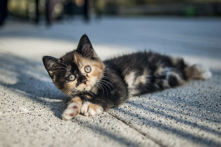 Cute kitten lying on the ground on a sunny day.