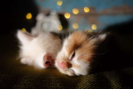 Cute white and yellow kitten sleeping on the sofa in the house. Soft focus